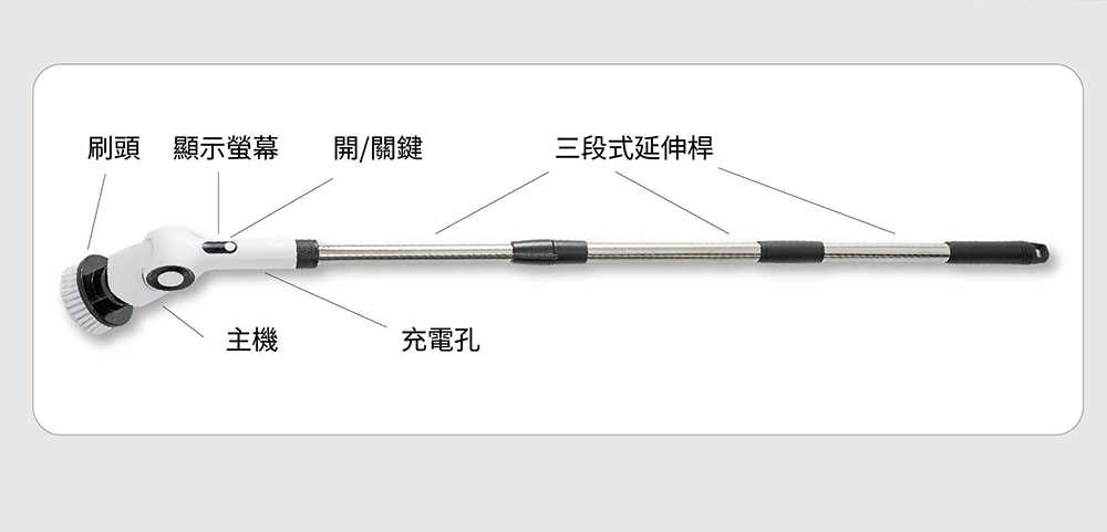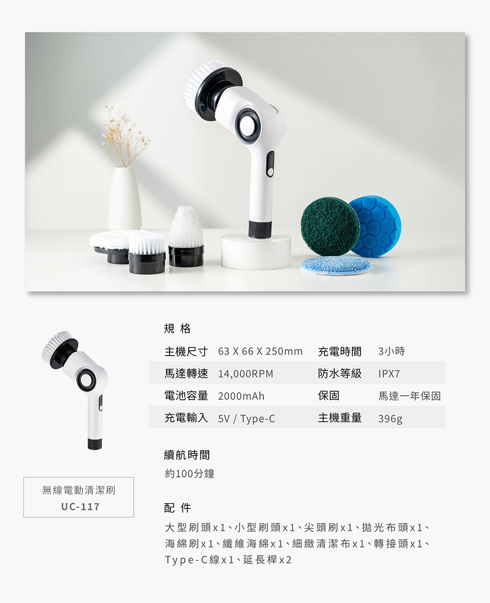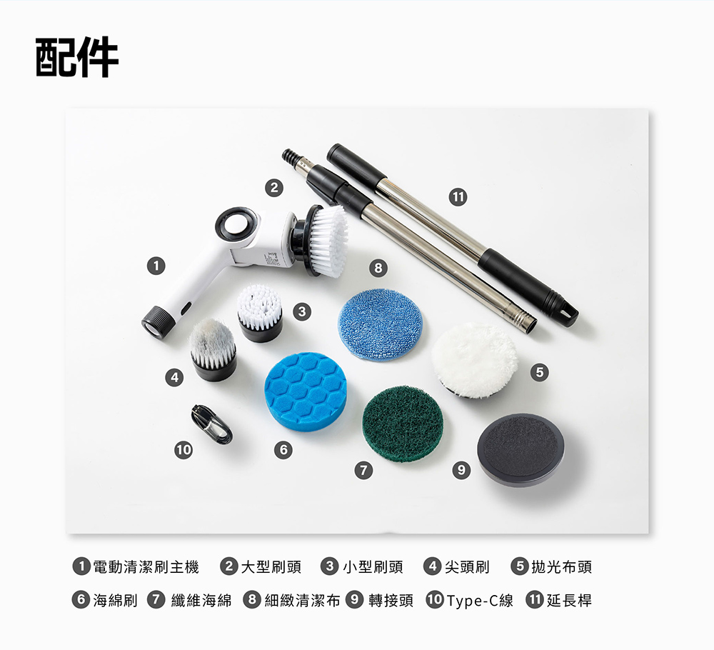 包裝內容物:主機x1、Type-C線x1、延長桿x2、轉接頭x1、刷頭x7。