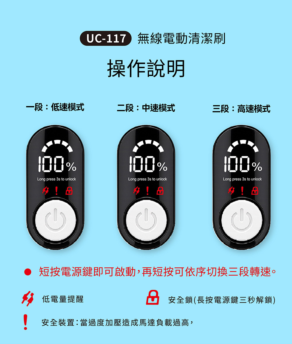 三段轉速 100/180/250RPM:依污垢強度自由切換