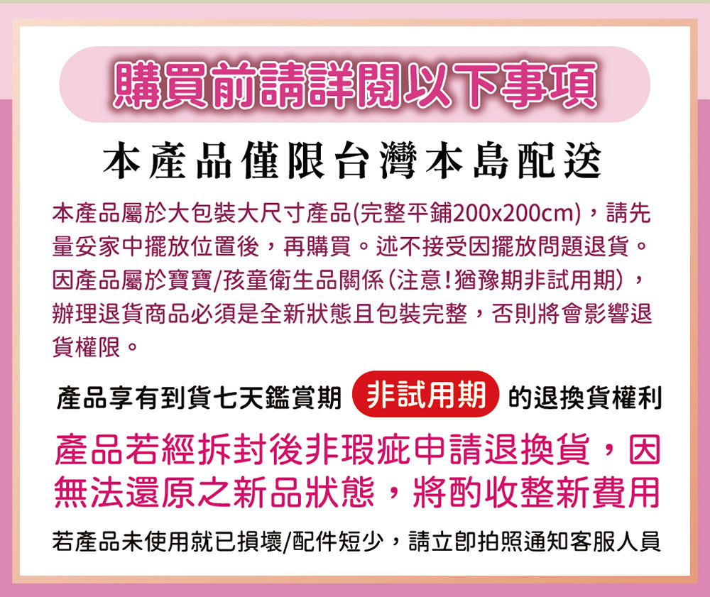 因產品屬於寶寶/孩童衛生品關係(注意!猶豫期非試用期),辦理退貨商品必須是全新狀態且包裝完整,否則將會影響退貨權限。
