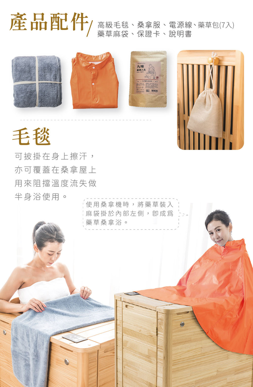 ■附贈:高級毛毯、桑拿服、藥草麻袋、藥草包(7入)、說明書、保證卡